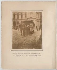 Yet, rather than assuming and lamenting the disappearance of all these features, a position associated with nostalgia and resignation, Hine emphasized their persistence. A case-in-point were Broadway’s horses. Despite widespread commentary since the 1890s about how the electric streetcar spelled the extinction of equine labor, his album features several horsecar photographs; a handwritten scrap, included in the endpages, listed ten sightings on one excursion alone (fig. 7). Hine further documented new or ongoing uses for horses: pulling tourist cars and ice trucks, or hauling away snow, trash, and building materials. They thus corroborate the claim by recent animal studies scholars that, for various reasons, urban horses — and their ancillary enterprises — actually increased in number and value during the century’s first decade. [6] For Hine, this was just one of the many “stron[g] contrasts” between new and old to be found on Broadway, which highlighted the heterotemporality of the urban environment.