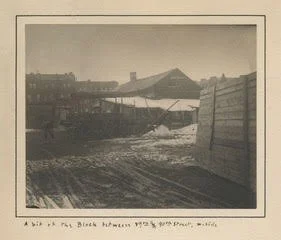 C. G. Hine, “A bit of the Block between 89th & 90th Street, w. side.” At the time home to a shanty and market garden, this block between Eighty-ninth and Ninetieth Streets was “once owned” — according to a draft caption Hine appended to the album — by Empress Eugénie of France. Looking for somewhere to invest the imperial fortune after her husband Napoleon III’s capture at the Battle of Sedan in 1870, she reportedly acquired this — and other New York properties — on the advice of her American dentist, Dr. Thomas W. Evans. At some point, Evans himself came to own this block, but he put off subdividing and selling the lots. After his death in 1897, the block remained empty as his heirs disputed the will. As apartments rose up around it, elite residents lodged “appeals, protests and petitions” with the city, decrying this blot on the landscape.