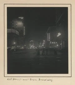 C. G. Hine, “ 42nd Street west from Broadway.” Before it was immortalized in musicals and movies, Forty-second Street was a border. One of fifteen cross-streets the 1811 Commissioners made wider than the rest, it marked the southernmost point locomotives were allowed to go, under an 1857 ordinance designed to keep the city free of smoke and danger. By the 1880s, it was “considered a ‘dead line’” between the theater district and the “Thieves’ Lair” of Longacre (later, Times) Square. Yet, once the American Theatre (visible in the distance) opened in 1893, and Oscar Hammerstein “crossed the line” of 42nd Street and built the Olympia two years later, other developers followed. By 1905, twenty-five theaters had clustered around Times Square, five of which can be seen here. Their lights were crucial to the colonization of Longacre; by flooding the darkness, they may have eased theatergoers’ anxieties about gangs and prostitution. Meanwhile, the rear of the Times building, visible in the foreground, became a cruising spot for gay men.