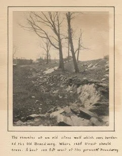 C. G. Hine, “The remains of an old stone wall which once bordered the Old Broadway. Where 123d Street should cross. About 100 feet west of the present Broadway.” Hine photographed, or noted, the remains of numerous fences, walls, and barriers that had been erected to delineate spaces along Broadway. This wall marked the edge of the old Bloomingdale Road, which had been left stranded in the middle of the block when Broadway was straightened in 1867. Like the “relic boundaries” of former territories, stone walls often outlived the roads they once lined, haunting the landscape as ghost streets. Hine’s caption notes the erasure of 123rd Street – one of several cross streets west of Broadway that were excised from the grid to grant privacy and exclusivity to the newly-created Riverside Drive and Claremont Avenue. Yet the area was slow to develop, in part because of the irregular property boundaries left behind by the Bloomingdale Road. Eventually, the Institute of Musical Art, a European-style conservatory that later evolved into the Juilliard School, was built in the middle ground. The hill to the right remained open land, as Claremont Park (now Sakura Park).