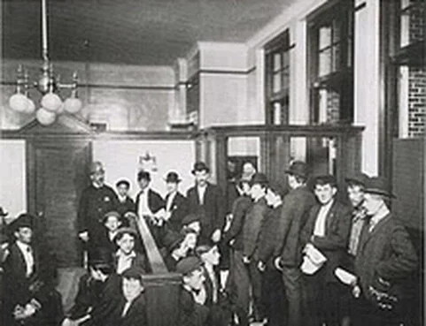 Hollow-eyed faces and clothes hanging off gaunt frames cover the photo of the interior of the men’s waiting room at the Milbank Baths, also taken by the Byron Studio in 1904. At the right, men wait in line, bowlers askew and towels in hand, while to their left, younger men cover the benches waiting their turn. A NYPD cop in a “bobby” hat stands guard in the back of the room, his stern visage insuring order among the handle-bar mustachioed fellows in the hall, 30 years of age and under for the most part.