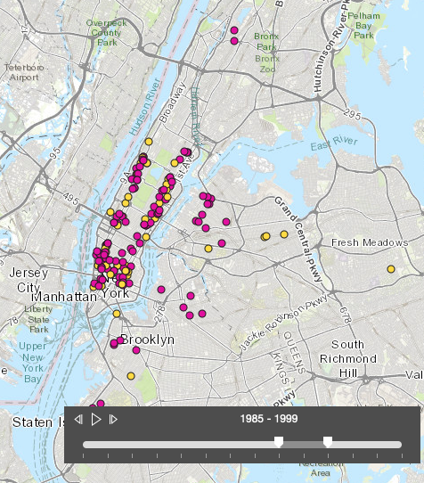 The Mexican Restaurants of NYC StoryMap website allows users to use a time-slider to view the proliferation of Mexican restaurants over time.