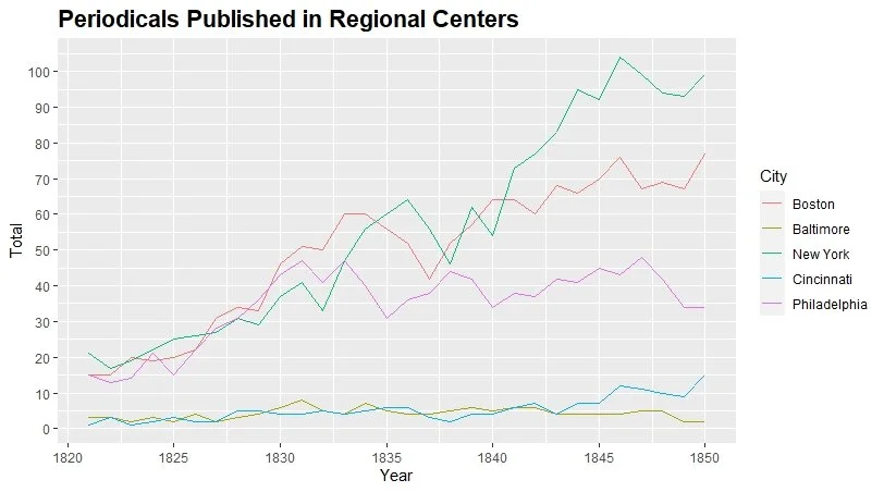 [1] Periodical publishing figures drawn from the American Antiquarian Society holdings; a tidied copy of this data is available at https://azleslie.com/data/antebellum-periodicals/.